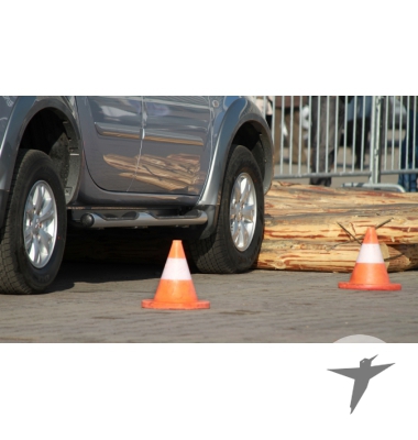 Скачать фотографию с изображением автомобиля, стоящего на брусчатке. Перед машиной лежит преграда – ошкуренные тонкие бревна, отражающиеся в глянце транспортного средства. На заднем плане виднеется забор и прохожие. Хорошее предметное фото, на котором видны шины, автомобиль. Может использоваться для автосайтов, блогов или статей в СМИ. Высокое качество снимка.