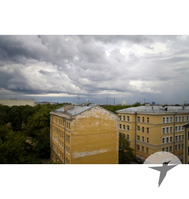 Скачать фотографию с домами Петербурга. На снимке изображен классический вид спального района с крыши – зеленая посадка, вдалеке виднеется собор с золотыми куполами, на переднем плане два дома из желтого кирпича с металлической серой крышей, вверху – питерское небо, всегда хмурое и холодное. Прекрасно подойдет для фотообоев или статей про Северную столицу России.