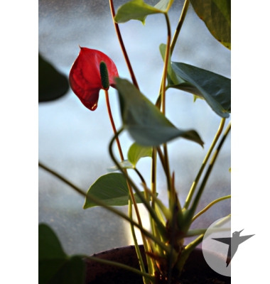 Скачать фотографию с необычным растением. На снимке изображено домашнее растение с крупными, мясистыми темно-зелеными листьями, а на заднем плане виден ярко-красный «цветок» необычной формы. Хорошая художественная ценность снимка, его смело можно использовать для фотообоев или в качестве иллюстрации в статье о домашних растениях.
