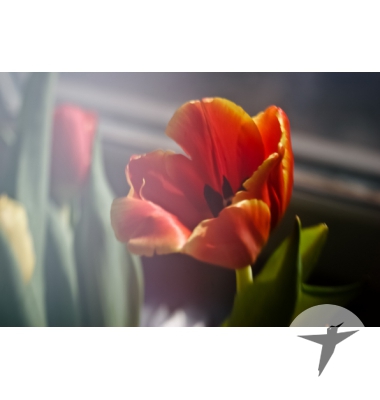 Купить фотографию с красным тюльпаном. На снимке изображен классический тюльпан: ярко-красные лепестки, желтая окантовка, черная сердцевина. Фотография сделана в необычной технике – растение находится как бы в тумане, задний фон размыт, четкость незаметно теряется. Хорошее изображение, которое можно использовать для статей о природе, для блогов или поздравлений, для небольших фотообоев.