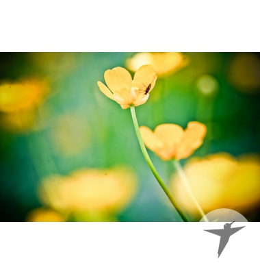 Купить фотографию с желтыми полевыми цветами. Очень красивые, небольшие цветы, на которые села какая-то мошка. Задний фон размыт, но зритель понимает, что это огромное поле с такими же цветами. Высокое качество самого снимка и удачный ракурс – цветок выделяется на фоне своих собратьев благодаря фокусу. Фотография подойдет для блогов и статей о растениях.