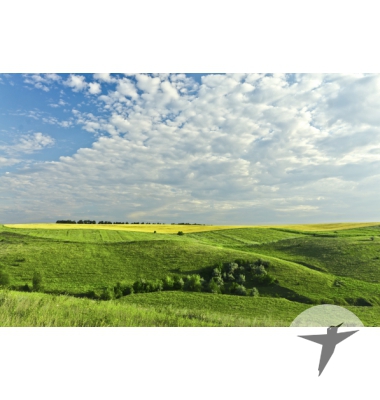Купить фотографию с весенним полем. Хорошая художественная ценность снимка. На фото видны зеленые поля, голубое небо и огромное количество белых, рваных облаков. На заднем фоне виднеется цветущее желтое поле, местность неровная, а холмистая. Вдалеке виднеется посадка деревьев, отрезающая одно поле от другого. Очень красивый снимок с плавными линиями переходов цветов.