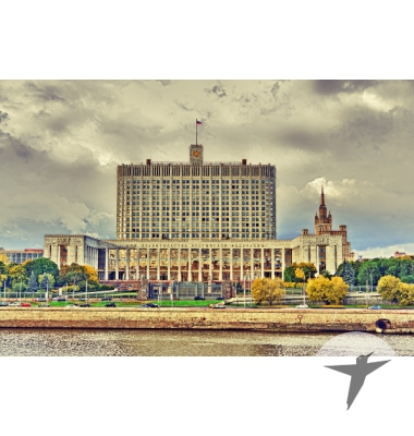 Скачать фотографию с домом правительства Российской Федерации. Фотография сделана осенью, в облачный день. На переднем фоне видны уже пожелтевшие деревья вперемешку с зелеными, а само здание возвышается до самого неба. Изображение кажется нарисованным из-за уникальной техники фотографирования. Отличный вариант для глянцевого журнала, СМИ и даже фотообоев.