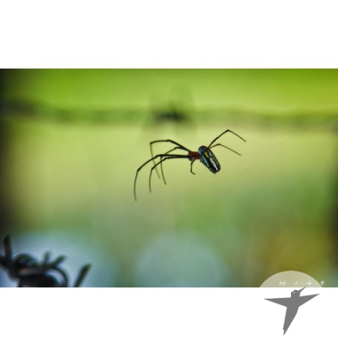 Скачать фотографию с пауком. Фотографу удалось поймать необычный момент – паук как бы застыл в воздухе. На снимке не видно ни паутины, ни каких- либо веточек, на которых он мог бы сидеть. Фокус сходится на самом насекомом, задний зеленый фон полностью размыт и не узнаваем. У паука выразительное, узнаваемое черное тельце с желтыми точками. Хорошее изображение для статьи о насекомых.