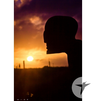 Купить фотографию необычной фигуры на фоне заката. Фотограф запечатлел в профиль человеческое лицо в маске – резкие, бойцовские линии, приплюснутый нос, угловатый подбородок. Уникальное фото, не только по своему содержанию, но и по цветопередаче – черты лица скрыты во тьме, но на заднем фоне видно заходящее солнце и необычный, африканский пейзаж.
