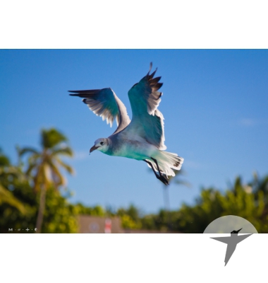 Купить фотографию с чайкой. На снимке изображена низко летящая чайка на фоне голубого неба и пальм. Фокус наведен четко на птицу, а задний фон красиво размыт. Фотографу удалось поймать редкий момент и сфокусироваться на летящей птице. Хороший снимок для статьи о путешествиях, турагентств, романтической истории или фотообоев – от него так и веет летом, морем и хорошим настроением.