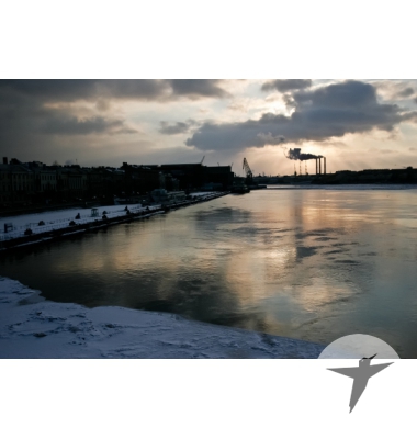 Скачать фотографию с зимним озером. Снимок сделан на закате – солнце уже почти зашло за горизонт, но до сих пор подсвечивает тучи. На заднем плане отчетливо видны заводские трубы, выпускающие дым, передняя часть озера уже покрылась тонким льдом, а задняя до сих пор сопротивляется морозам. Очень хороший снимок, который понравится людям, любящим города.