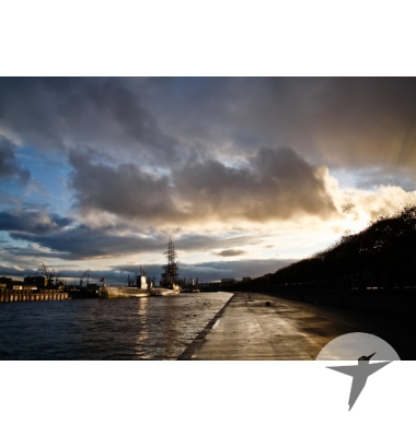 Скачать фотографию с набережной Северной столицы. Снимок передает всю суть Петербурга – серые краски, сырость и морская прохлада. На фотографии виден знаменитый парусник, а рядом с ним «всплыла» подводная лодка. Очень интересное небо – засвеченное по правой стороне, оно переходит в тяжелые облака слева. Отлично подойдет для фотообоев или туристического блога.