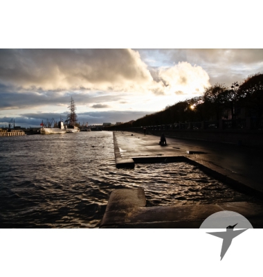 Купить фотографию с набережной Петербурга. Снимок сделан ранним утром – солнце еще не взошло, но прохожие и рыбаки уже заняли набережную. Слева на фоне видно подводную лодку и знаменитый парусник – это необычное сочетание очень гармонично смотрится. Интересная цветопередача – цвета как бы затемнены: яркое небо, но серое море и посадка по правому краю.