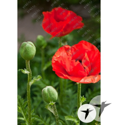 Купить фотографию с красными маками. Два роскошных красных мака уже распустились, радуя окружающих своей красотой. На заднем плане видны два зеленых бутона, которые уже отцвели и готовятся дать урожай. Очень яркая и красочная фотография – цветы на ней как будто совсем живые!