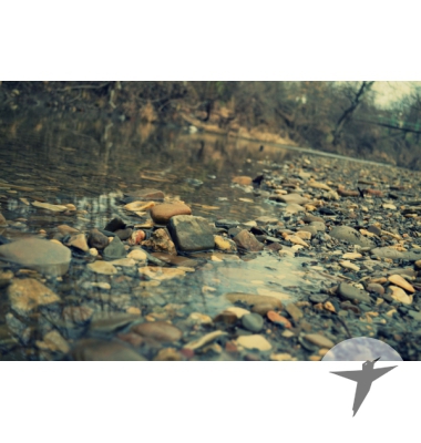 Скачать фотографию с рекой. Каменистый берег, по которому течет вода, практически растворяется в поверхности реки. Очень красивое и художественное фото, сделанное на интересный объектив.Фокус наведен на правую часть фото, левая немного замылена. На заднем фоне виднеется небольшой мостик через реку. Отличный вариант для фотообоев.
