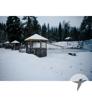 Купить фотографию с беседками, занесенными снегом. Отличное фото, сделанное в лесу или парке, хорошо передает короткий зимний день. Серое небо, огромные сосны, покрытые снегом, несколько беседок, лавочка возле замершего прудика и одинокий домик вдалеке.Прекрасный вариант для фотообоев или журнала. Небольшая стоимость снимка в базовой лицензии.