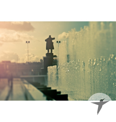 Купить фотографию памятника Ленину, снятую с необычного ракурса. На переднем плане струи воды, бьющие с фонтана, а сам памятник стал как бы фоном. Фокус наведен на струи воды и на самого Владимира Ильича. Очень интересная цветопередача: розово-бежевое небо, темный памятник и бирюзовая вода, отлично подчеркивающая общее настроение фотографии.