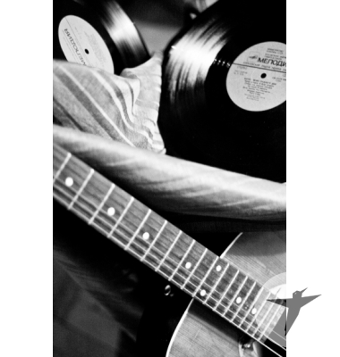 Черно-белое фото, возвращает зрителя в музыкальное прошлое, показывая нам грампластинки и потертый гитарный гриф, на льняной ткани.